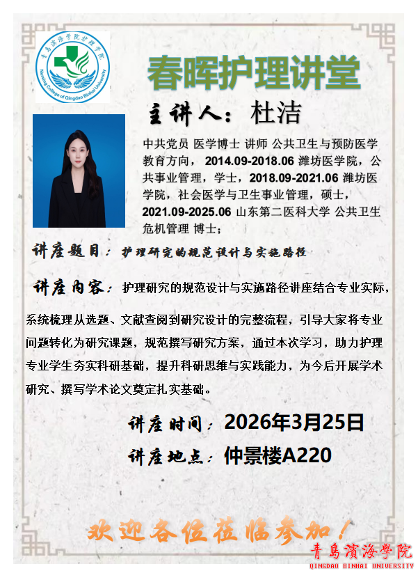 【专业建设】春晖护理讲堂讲座预告——护理研究的规范设计与实施路径