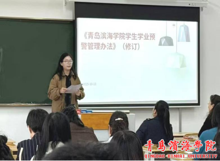 随后,李元梦老师清晰阐述近期教学核心任务。针对全体青年教师,她鼓励积极参与讲课比赛,以赛促教,在竞赛中相互学习、共同进步,提升教学能力。日常教学方面,她明确考勤点名须课后第一时间完成,以维护教学秩序的严谨性;若学生出现异常,教师要第一时间与班主任对接,全力保障学生安全健康。同时还提醒班主任,大学生体测将于12月开展,鼓励大家提前有针对性锻炼,以良好状态迎接挑战。此外,李老师从总则、学业预警工作机制、工作程序、学业帮扶工作机制以及附则五个维度,深入解读《青岛滨海学院学生学业预警管理办法》(修订版)。她详细讲述学业预警的实施标准与帮扶路径,为学生学业保驾护航。通过这些举措,学院从教学管理、教师能力提升、学生日常保障以及学业指导等多方面发力,全方位促进教学质量的提高与学生学业的发展,助力学生在校园中收获知识、茁壮成长,为未来的发展奠定坚实基础。