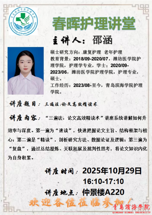 【专业建设】春晖护理讲堂讲座预告——三遍法:论文高效精读术