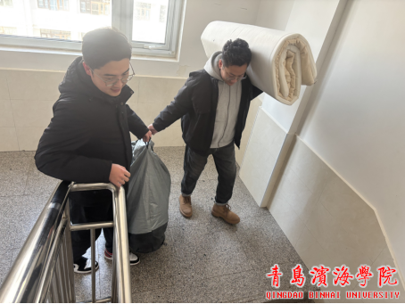 集合完毕后,赵玉栋干事简要明确分工,党员老师、学生处老师与保安大叔迅速投入到帮扶工作中。大家不顾天气寒冷,主动扛起沉重的行李箱、抱起摞高的行李,穿梭在公寓楼道与指定楼层之间,有条不紊地协助同学们搬运行李。过程中,老师们不仅出力搬运,还耐心询问同学们的实习近况和生活需求,叮嘱大家注意搬运行李安全、在整理宿舍时做好防护;公寓辅导员们则熟练地指引路线、帮忙照看临时堆放的行李,为搬运工作保驾护航。面对体积大、重量沉的物品,众人齐心协力、互帮互助,用默契的配合高效完成每一次搬运;遇到行动不便或行李较多的同学,大家主动上前全程帮扶,用暖心举动化解了同学们独自搬宿舍的困境,公寓楼道里处处洋溢着多方同心、师生情浓的融洽氛围。